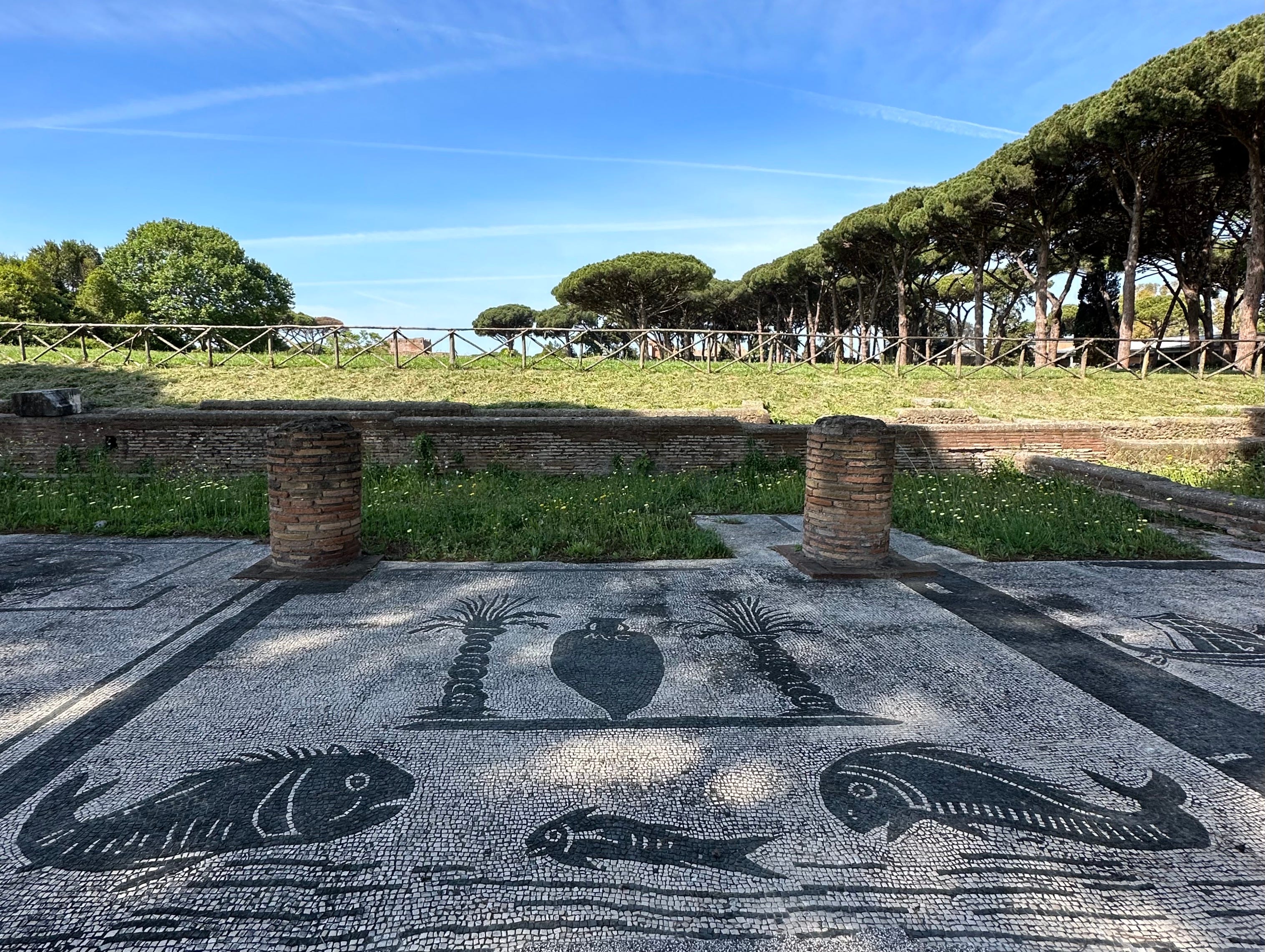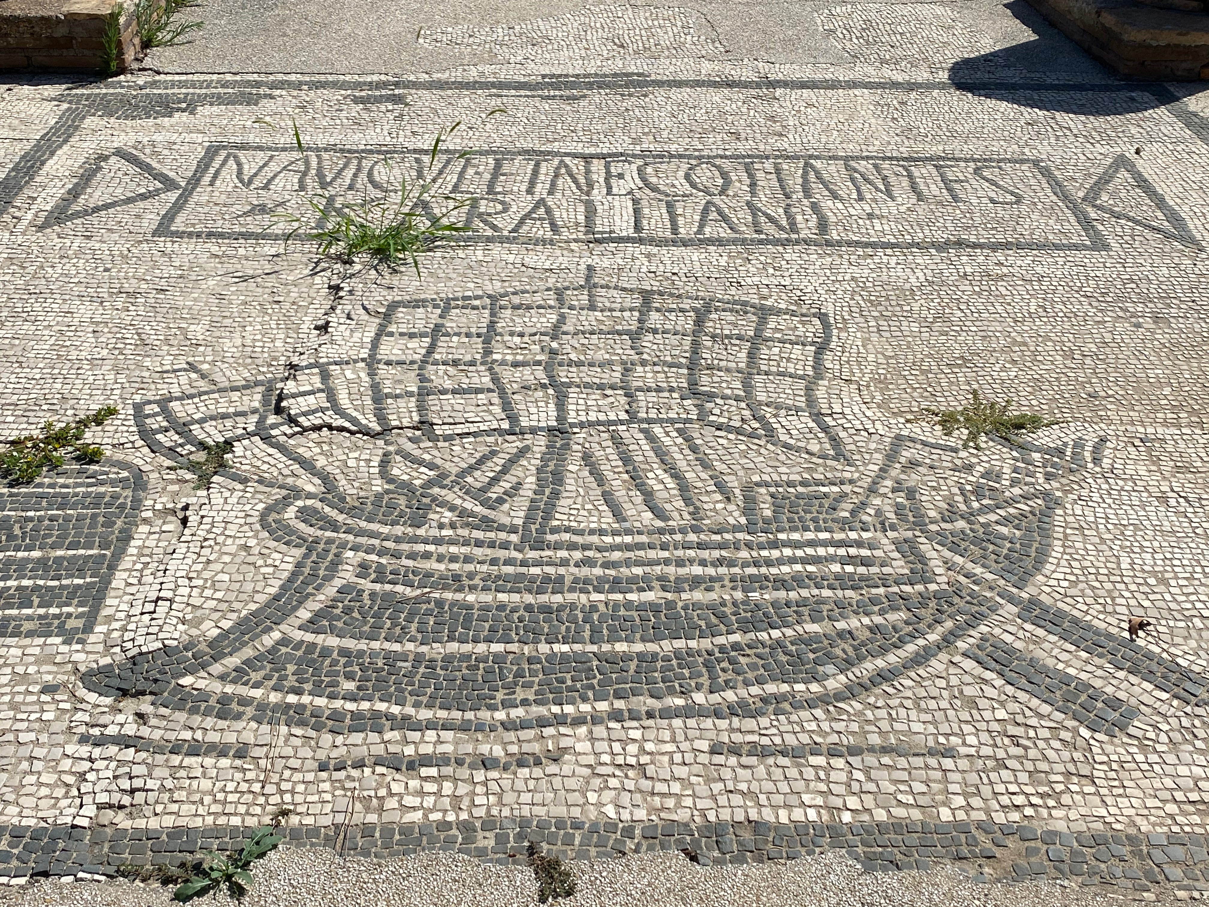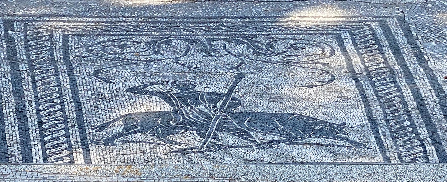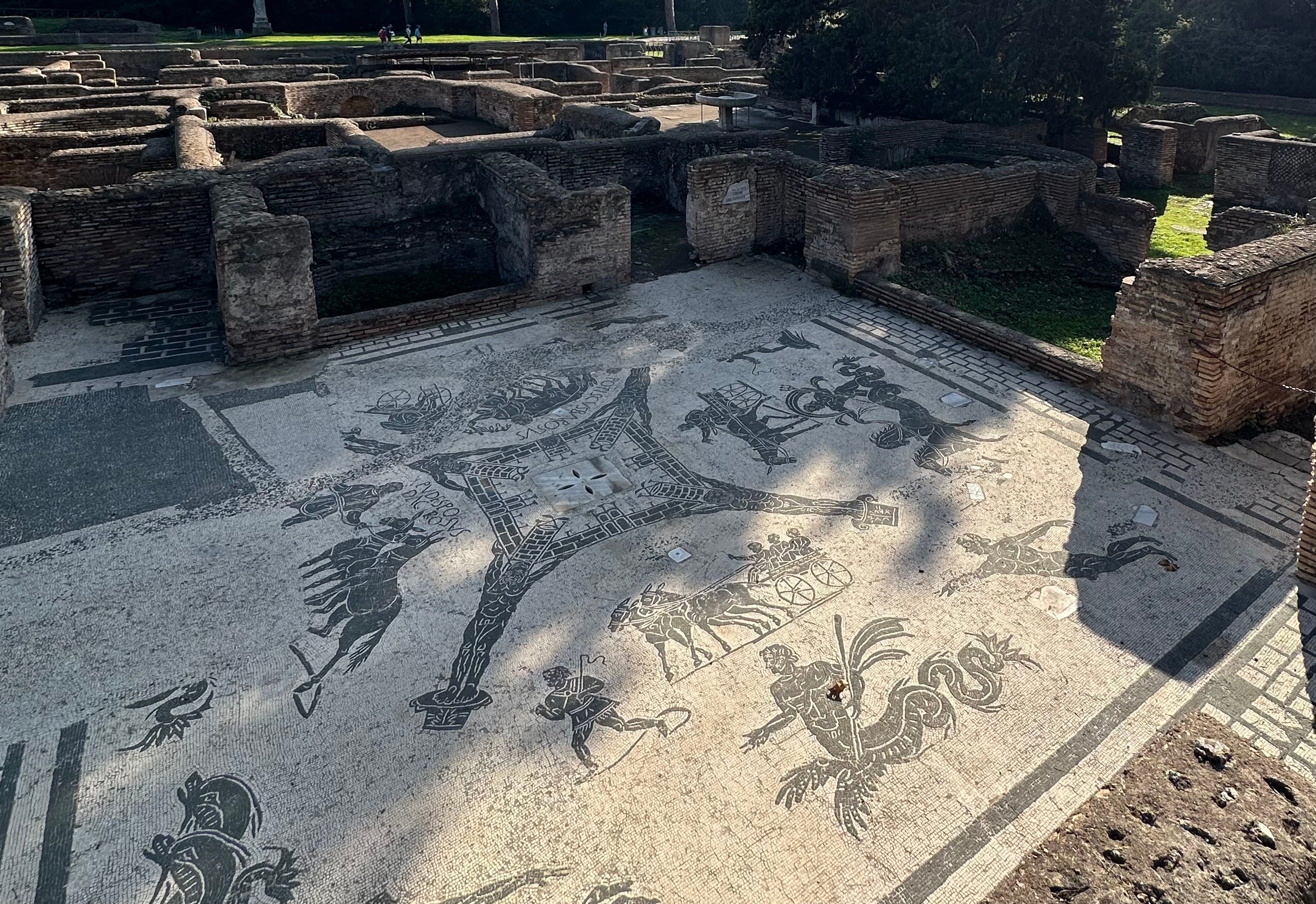 As one reaches the road, mosaics of the bath complex of the Cisarii are visible (even in the winter months when many of the mosaics at Ostia are covered to protect against frost these usually remain visible). The Cisarii were cab drivers, who would ferry merchants from the Porta Marina at what was once the coast into Ostia proper, perhaps to inspect their warehouses, or to their lodgings at the port. The charmingly literal black and white mosaics show suitably marine themes—swimmers and sea creatures—as well as images of the carriages pulled by mules driven by the men who once sweated and gossiped and grumbled in these rooms.