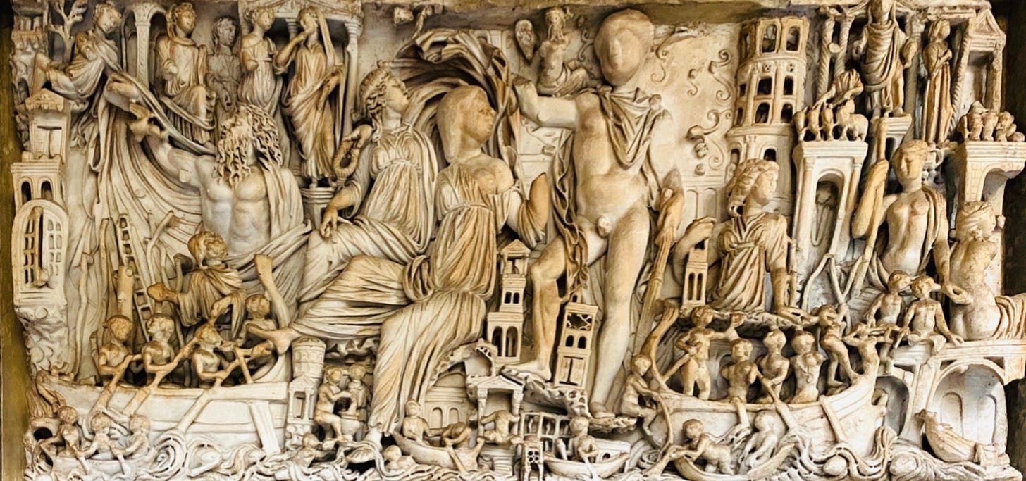 When we reach the city limits at what remains of the Porta Romana we enter the city of the living, to our right we have to imagine the river dense with barges being loaded and unloaded into the warehouse buildings, as per this relief now in the Vatican Museums.