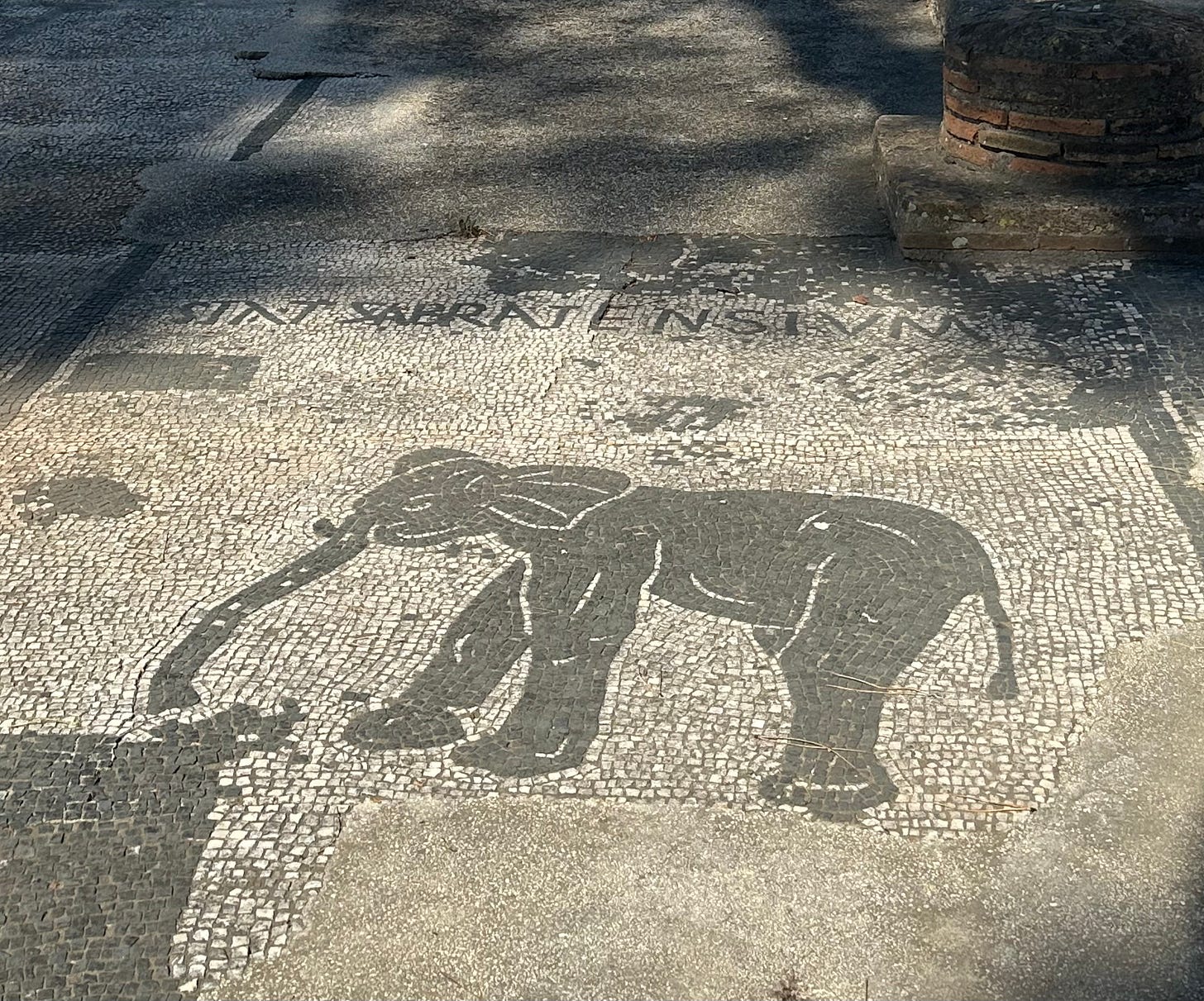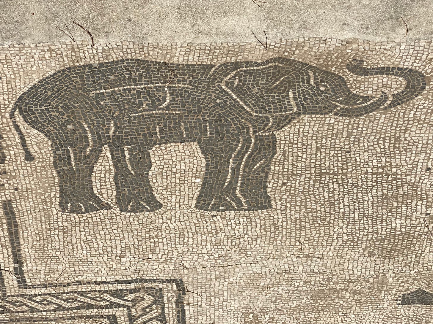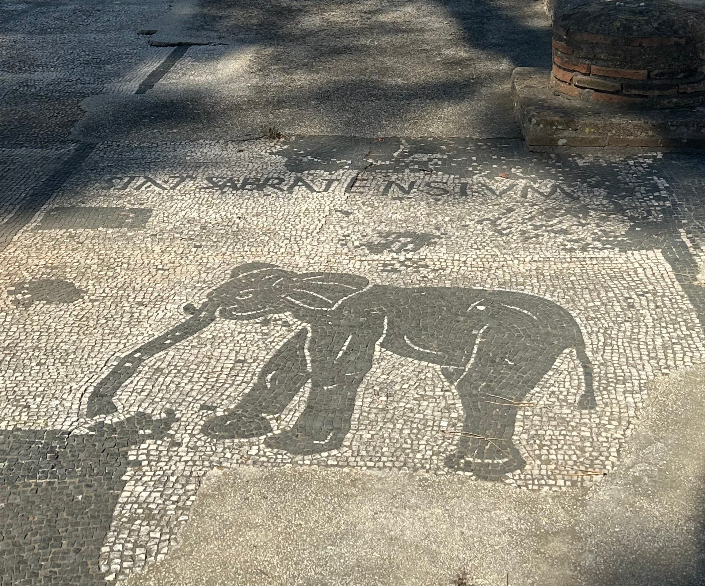 The imports of both bread and of circuses are reflected in the mosaics of the offices of the prosperous merchants and shipbrokers who had offices at Ostia: animals and enslaved fighters—including gladiators—for the various games. Above a bull and his adversary, below elephants designed by artists who had, we can assume, probably seen one in person.