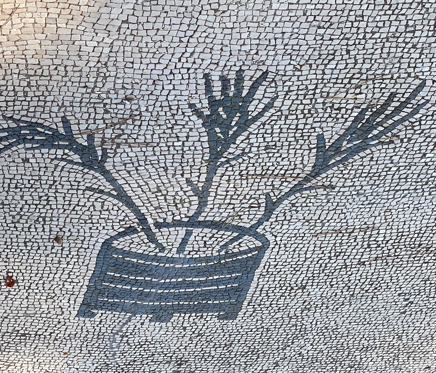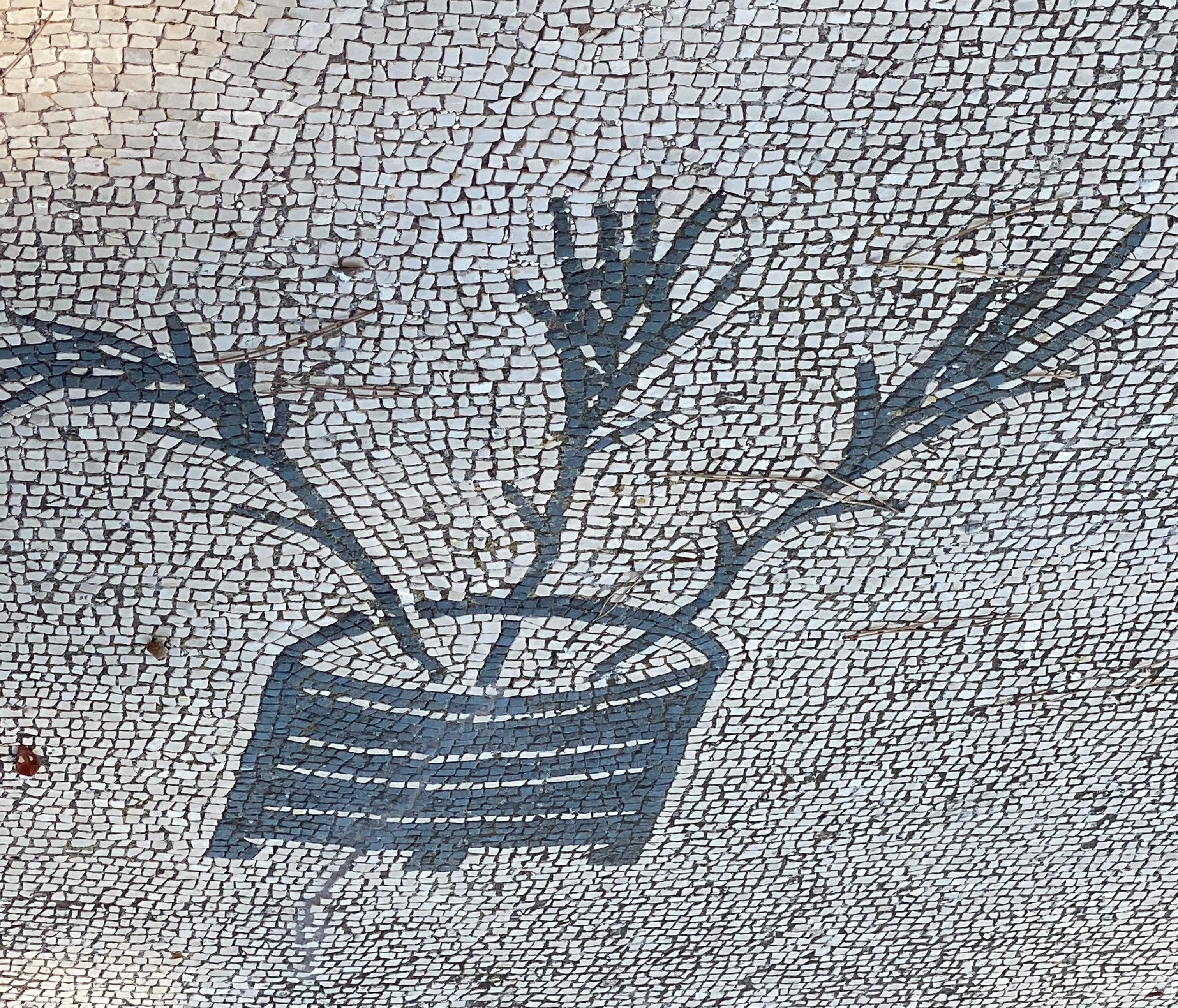 In the centre of the once colonnaded and paved “piazza” are the remains of the base of a temple, probably dedicated to Ceres (from which “cereal”) the goddess of the harvest associated particularly with grain. There are many mosaic depictions of the implement below, a sort of winnowing basket for the separation of the wheat from the chaff, replete with ears of corn.