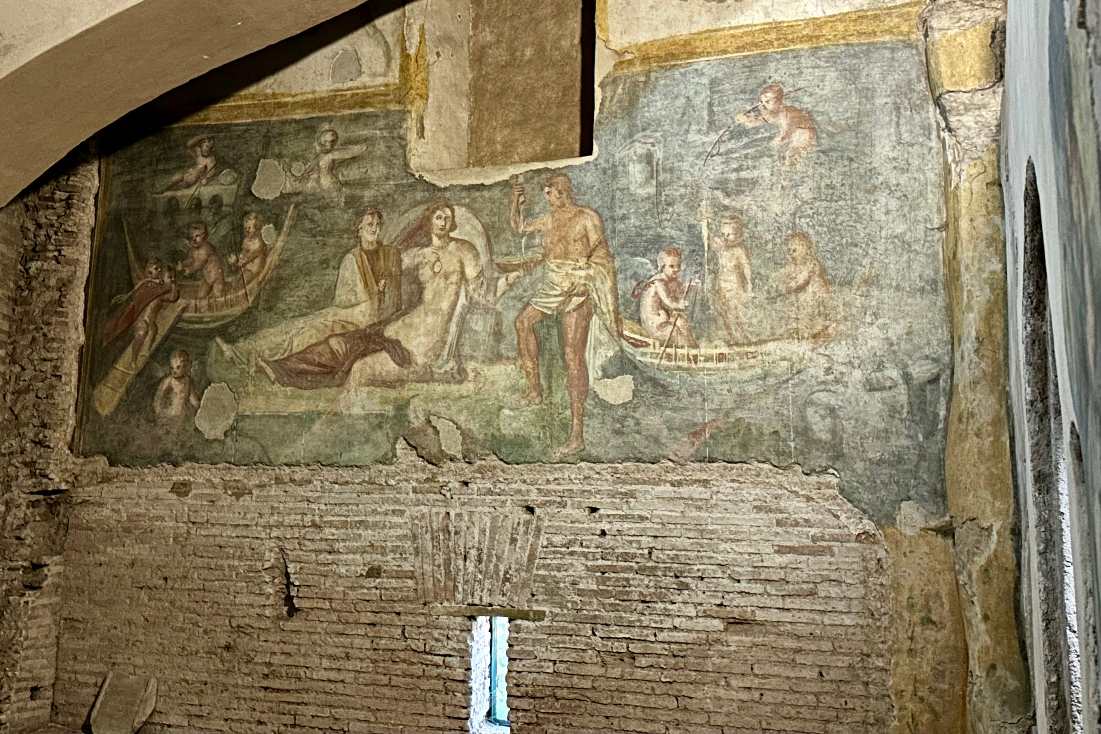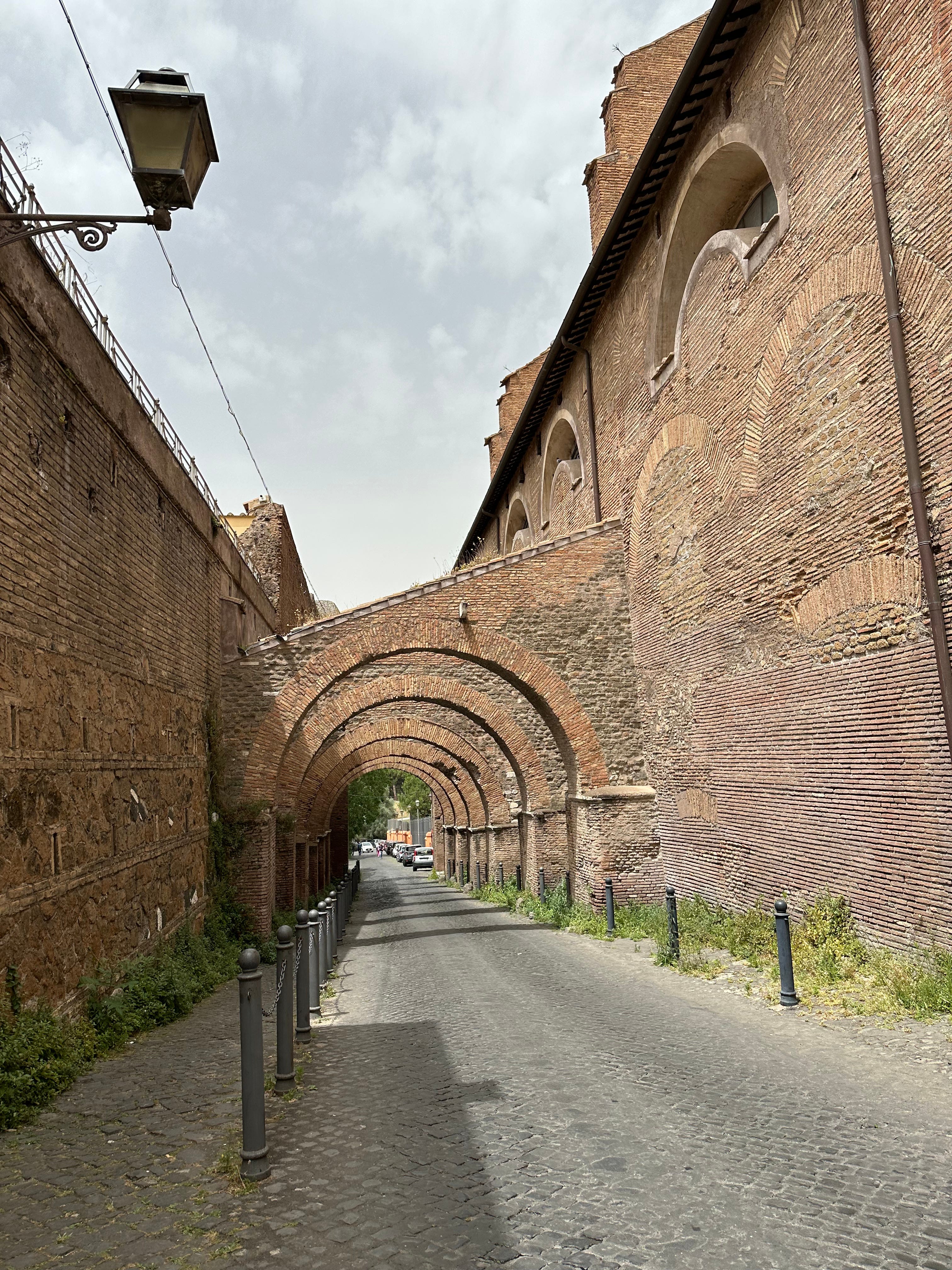 The street serves as a synecdoche for the rise and fall of Rome’s wider population: from densely built apartment buildings in the second century—though considerably more desirable than those in the miasma of the low-lying Subura—to conversion to a single and very grand late Imperial house replete with frescoes, (lost) marble cladding, and an internal courtyard in the third. In the very last gasp of the fourth century, by which point Rome was a Christian city, a vast church was built incorporating the facades of the clivus scaurus and in part burying the domus to level the steep hillside. Arches across the road act as buttresses between the church and the section of the Aqua Claudia on the other side of the road.